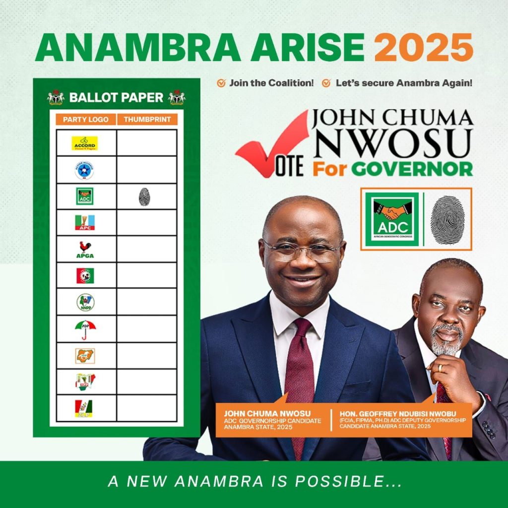 A vote for the African Democratic Congress (ADC) on November 8 2025, is a vote for emancipation and comprehensive recovery in all facets of development. Mr. John Chuma Nwosu and Dr. Geoffrey Ndubisi Nwobu exemplify humility in leadership and a steadfast commitment to our progress.