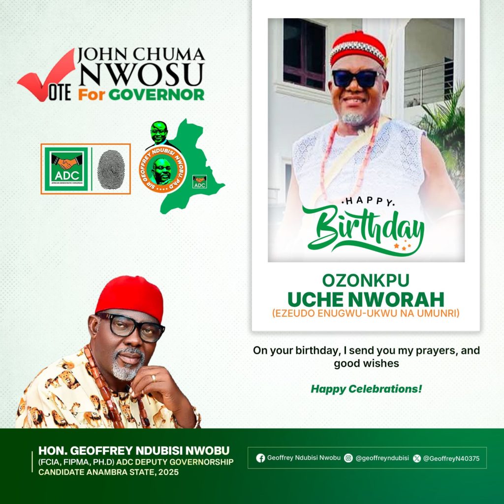 AWKA, FRIDAY, September 5, 2025 – Hon. Ndubisi Nwobu, PhD (Obuka Awka), the Deputy Governorship Candidate of the African Democratic Congress (ADC) for the upcoming November 8, 2025, Anambra gubernatorial election, has extended warm felicitations to the renowned media luminary and cultural icon, Ozonkpu Uche Nworah (Ezeudo Enugu-Ukwu na Umunri), on the occasion of his birthday.